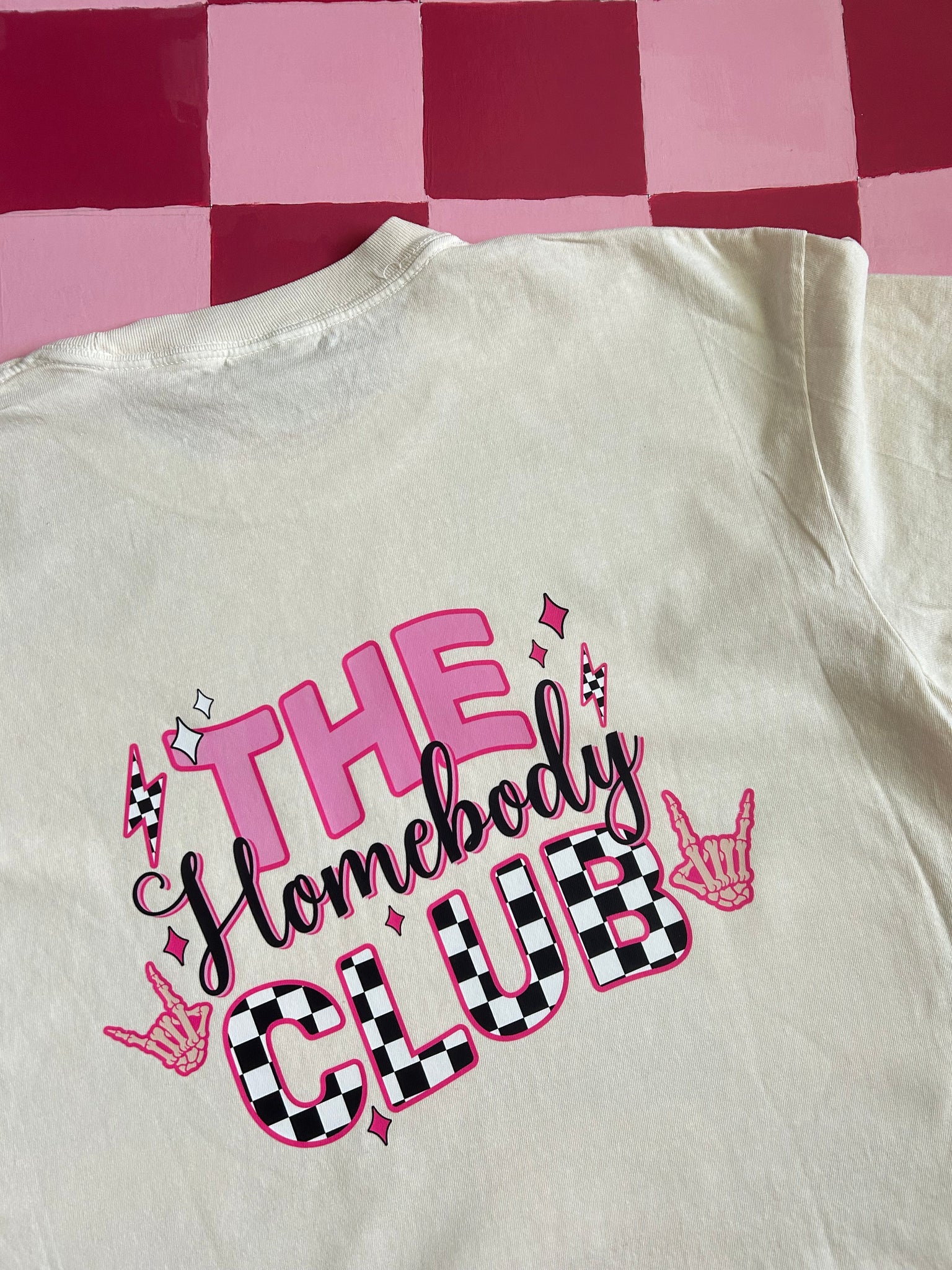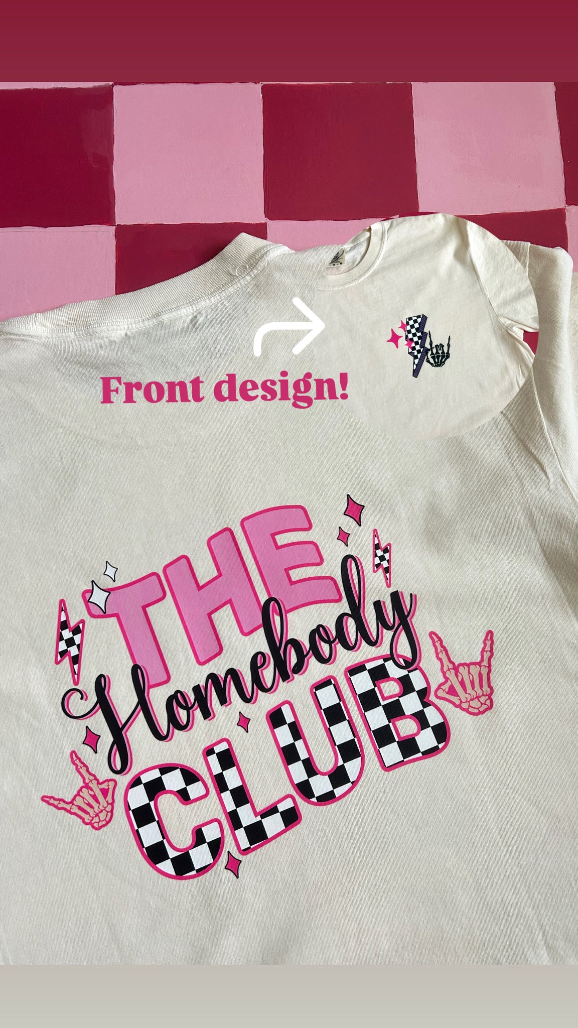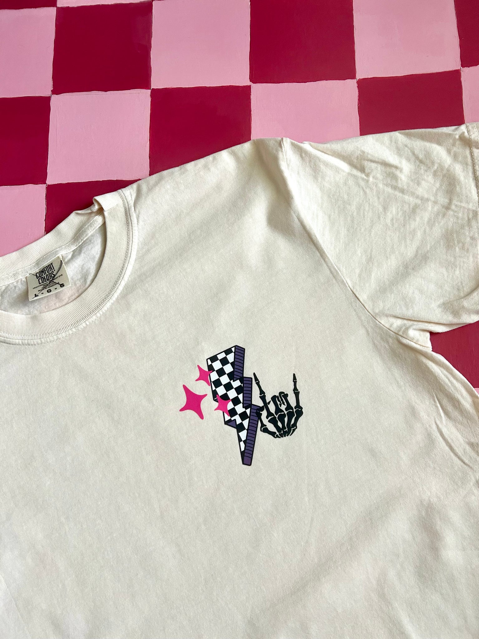 A cute racer type vibe for the homebody’s out there! Pink and black design shown on an Ivory Comfort Colors tee.